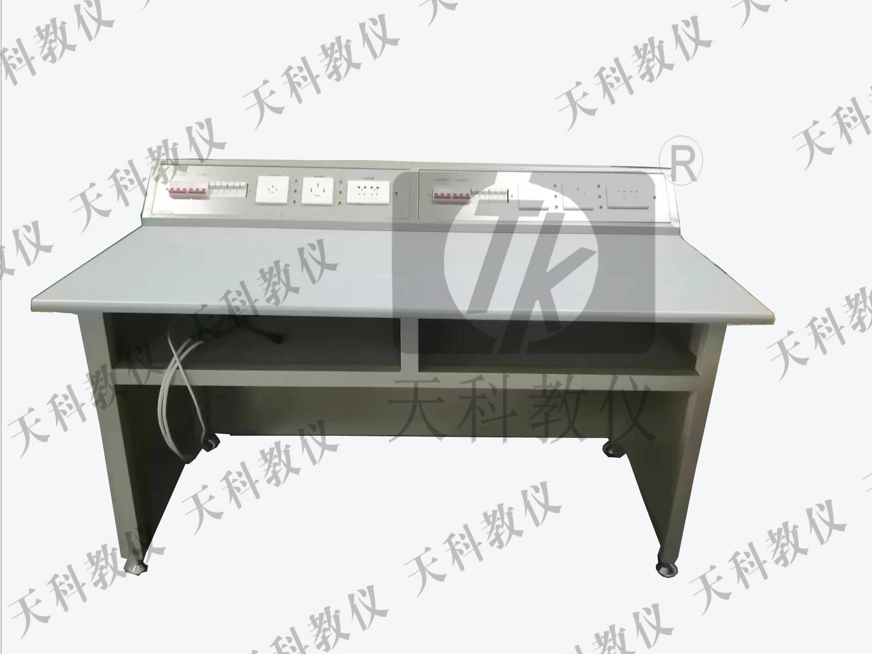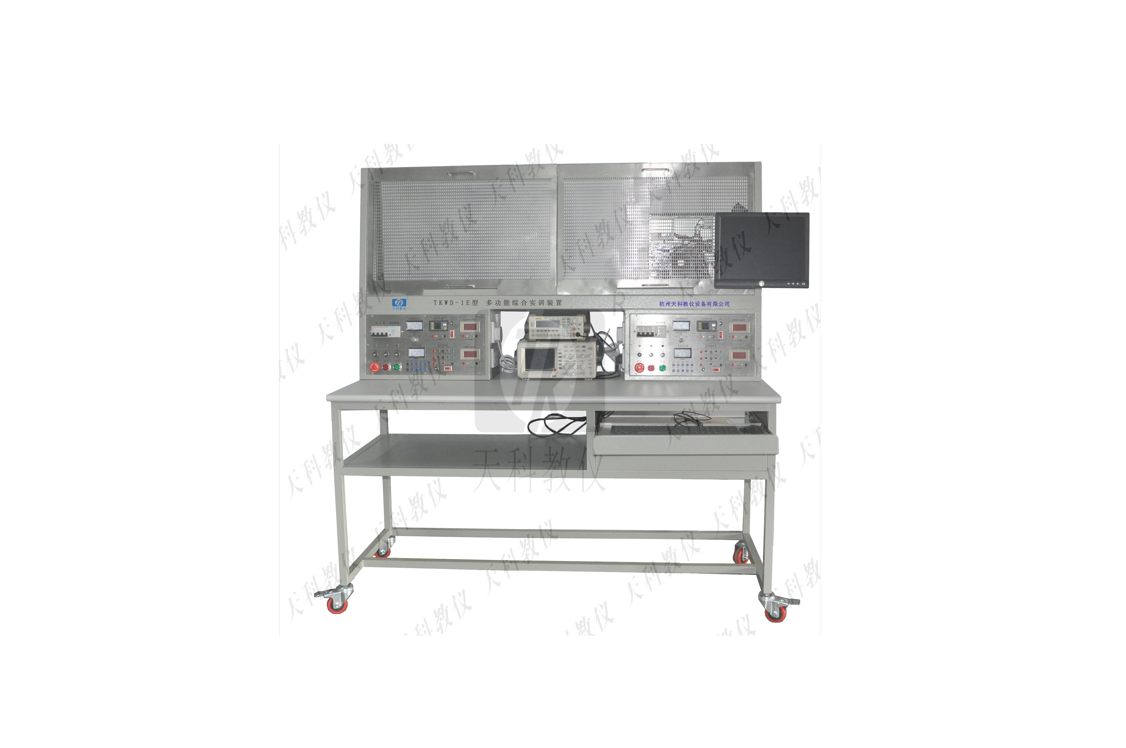 该实验装置主要由实验桌和网孔板组成,学生通过实验经路进行元气件的布局安装,接线全部由学生自行完成,培养学生的动手能力和操作技能,实验项目可自行确定,选择相应的元器件来完成实验,也可作为电工考证的考核设备。