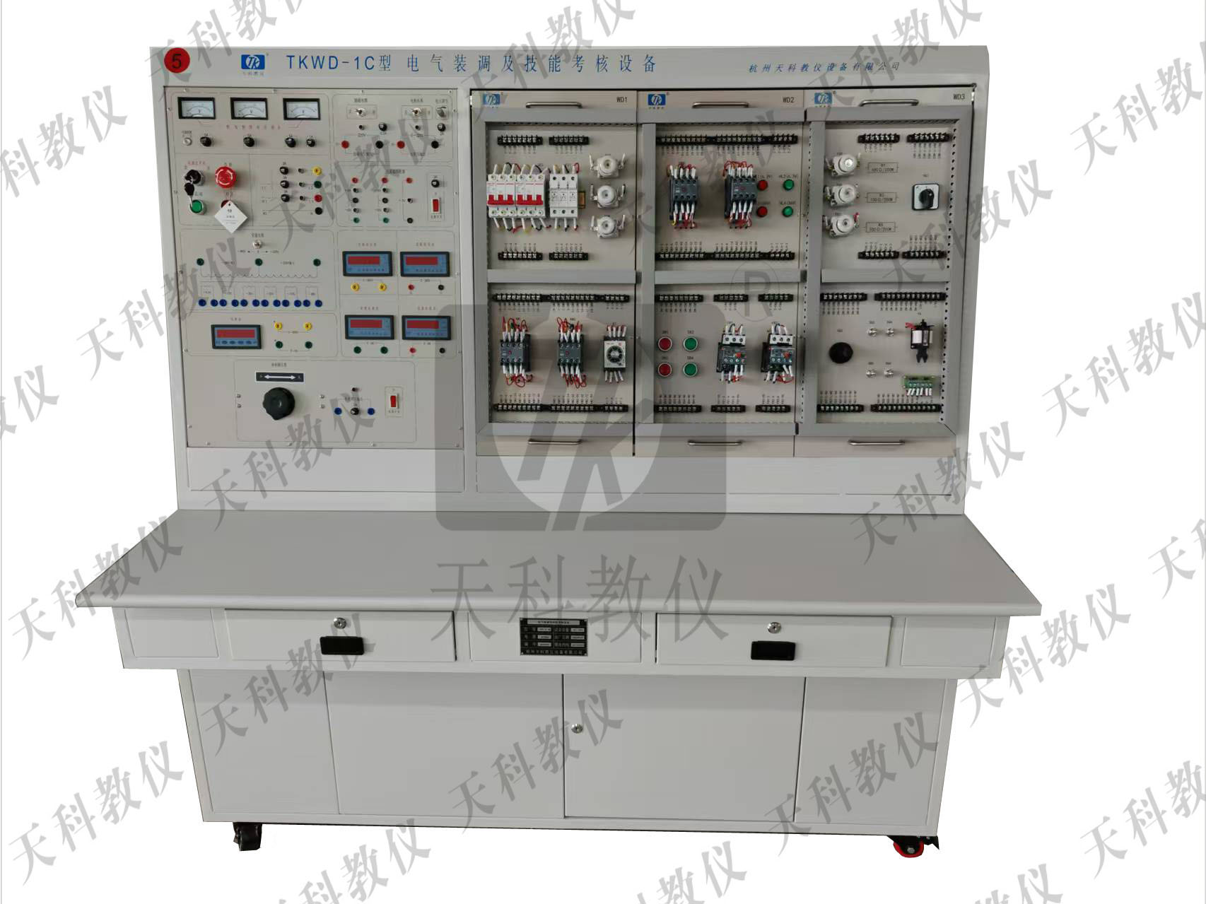 “TKWD-1A型中级维修电工及技能考核实训装置”是根据机械工业职业技能鉴定指导中心组织编写的《机械工人职业技能培训教材》而研制生产的,可对《初级维修电工技术》和《中级维修电工技术》教材中列出的电气控制线路和实用电子线路进行实际操作,从而使学生的操作技能得到提高。该实训装置不仅可供学生学习锻炼,更是初级维修电工技能考核的理想设备。