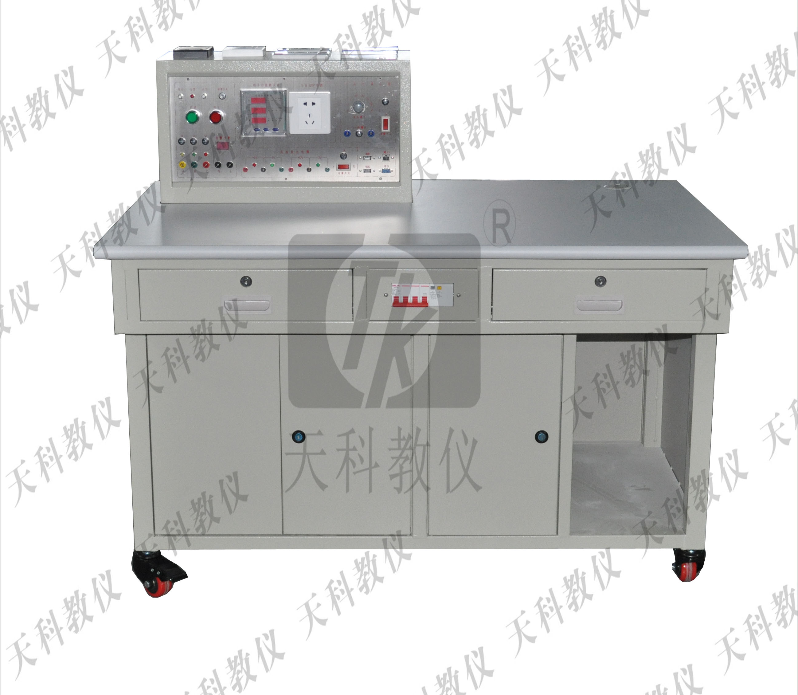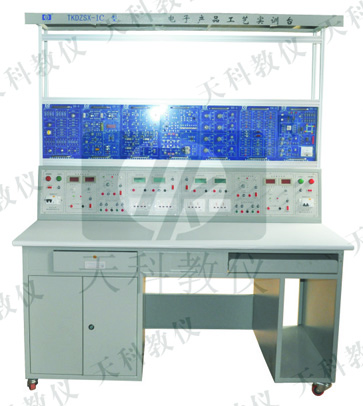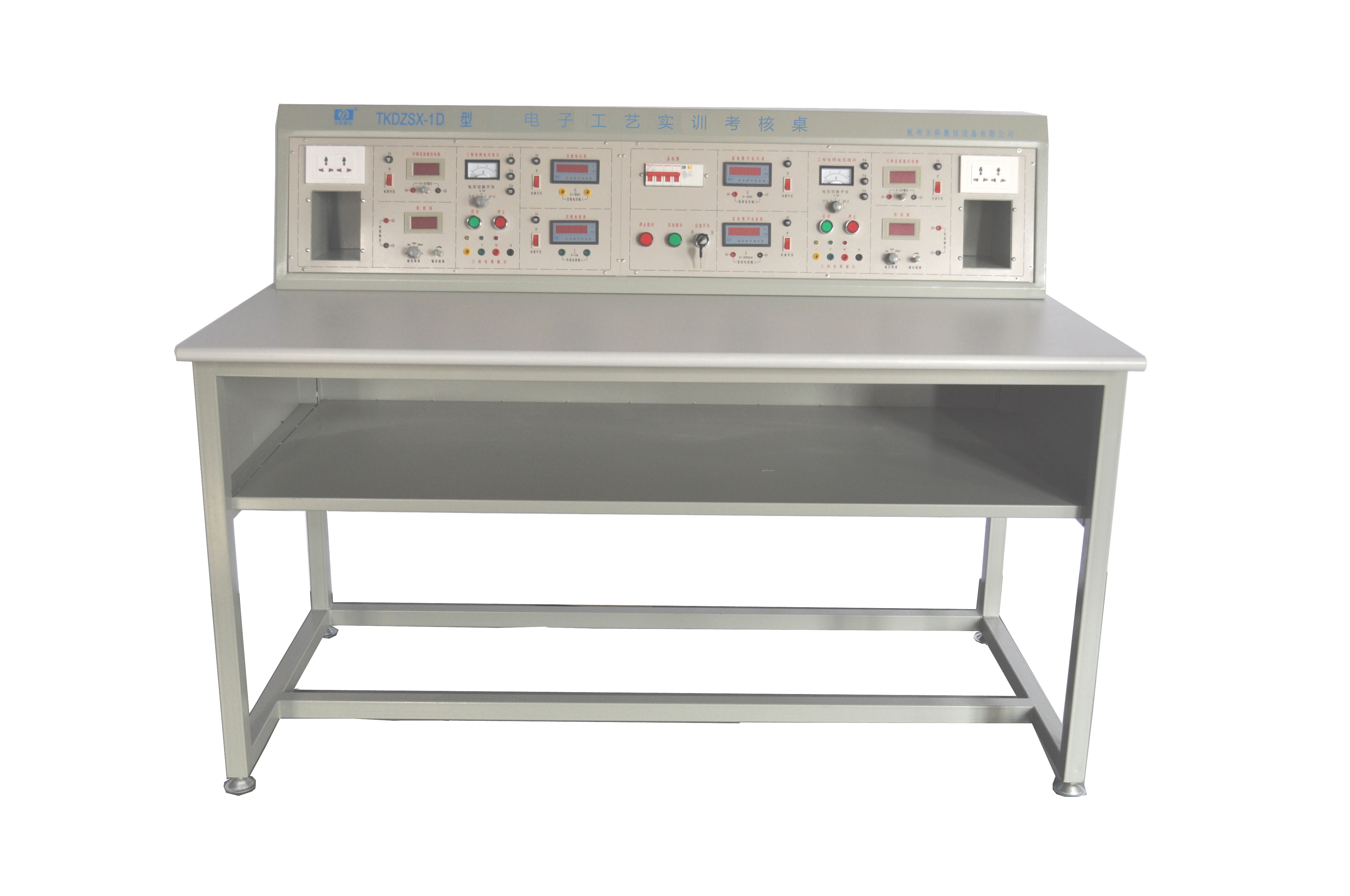 此实训台为双人座,每个工位装有照明日光灯、看板(用来夹资料)、仪表台、插座。学生在这里可以仿真生产过程(如:工艺流程的编制、线路板的调试、整体产品的组装),组装后的装配线安全、可防静电。